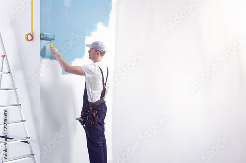 Decorator Wearing A Overall Painting A Room On A Blue Color